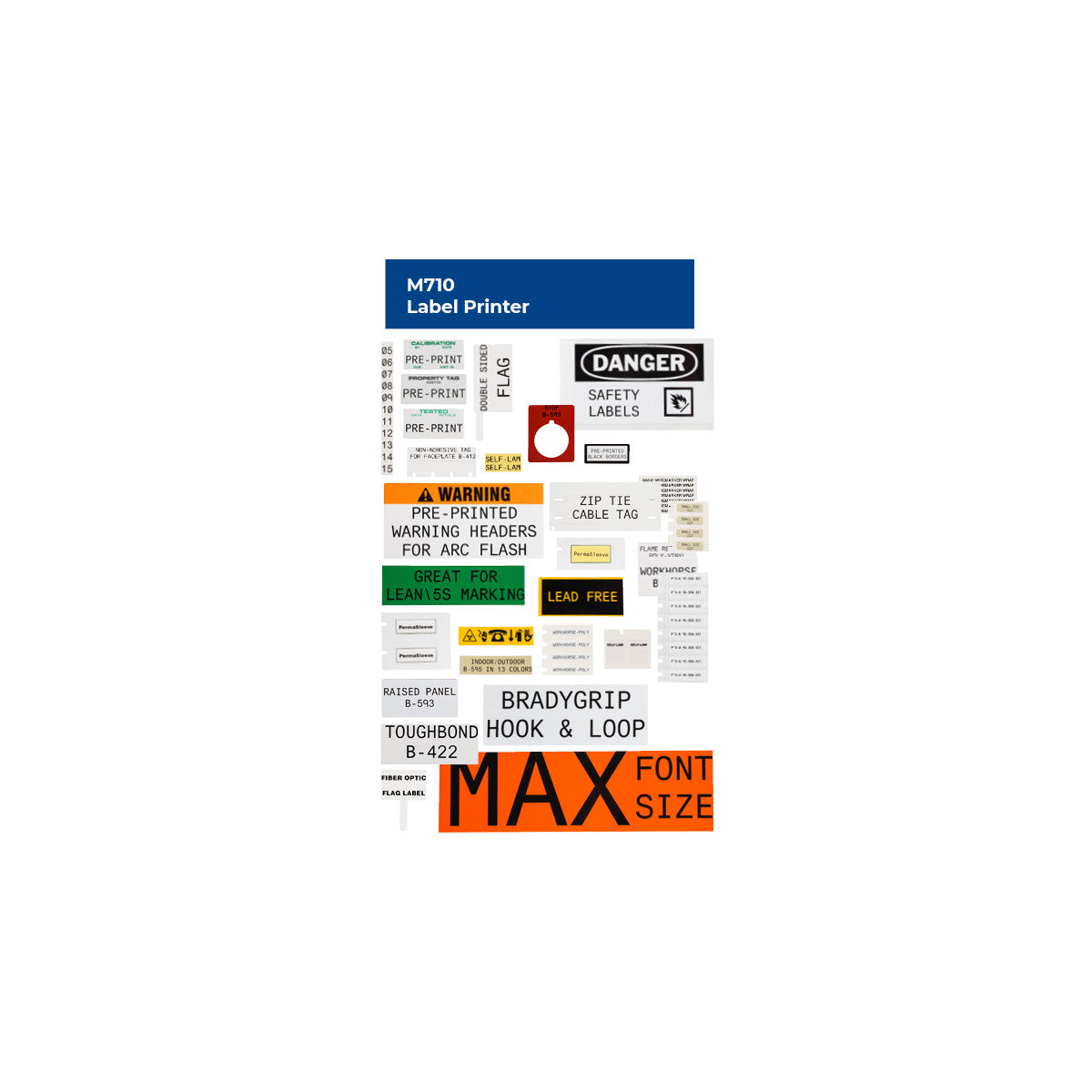 | Incluye | (1) Adaptador de CA/cargador de batería (M710-AC), (1) Adaptador de materiales (M71-ADAPT-BK), (1) Batería recargable (M-LION-BATTERY), (1) Cinta de impresión libre de halógenos (M7-R6000), (1) Controladores, (1) Garantía limitada de 2 años, (1) Guía de inicio rápido, (1) Guía de usuario, (1) Impresora de etiquetas M710 (M710), (1) Inserto con información de descarga de Diseño e impresión básicos de Brady Workstation, (1) maletín rígido M710 (M710-HC), (1) Rollo de etiquetas blancas de vinilo para interiores y exteriores (M7C-1000-595-WT), (1)Cable USB (USB-C-A-CABLE) |