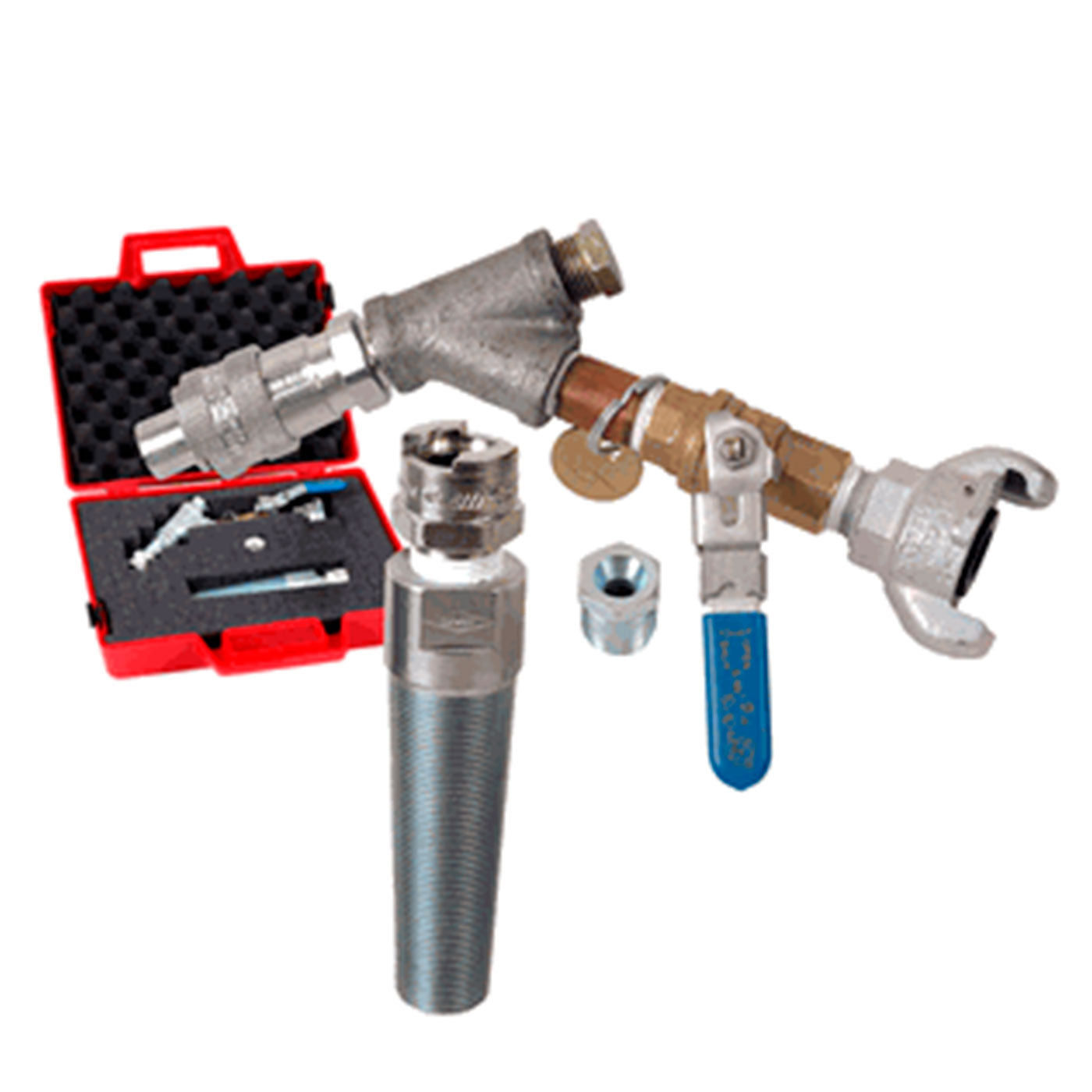 El kit de pistola para soplado de 1 1/4" de GMP incluye una pistola con control de aire, adaptadores de 1 1/4", 1 1/2" y 2", un accesorio Chicago, una desconexión rápida, un tapón sólido y estuche protector para garantizar presurización y maniobrabilidad en conductos.