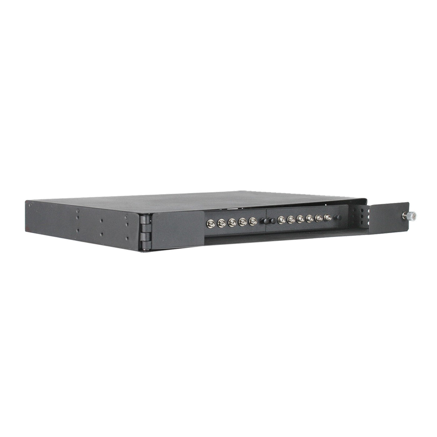 Distribuidor de fibra óptica abatible de 1UR para 12 fibras monomodo G.652 D, acopladores FC/UPC, terminación y empalme para montaje en rack