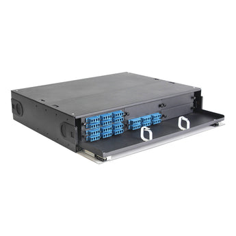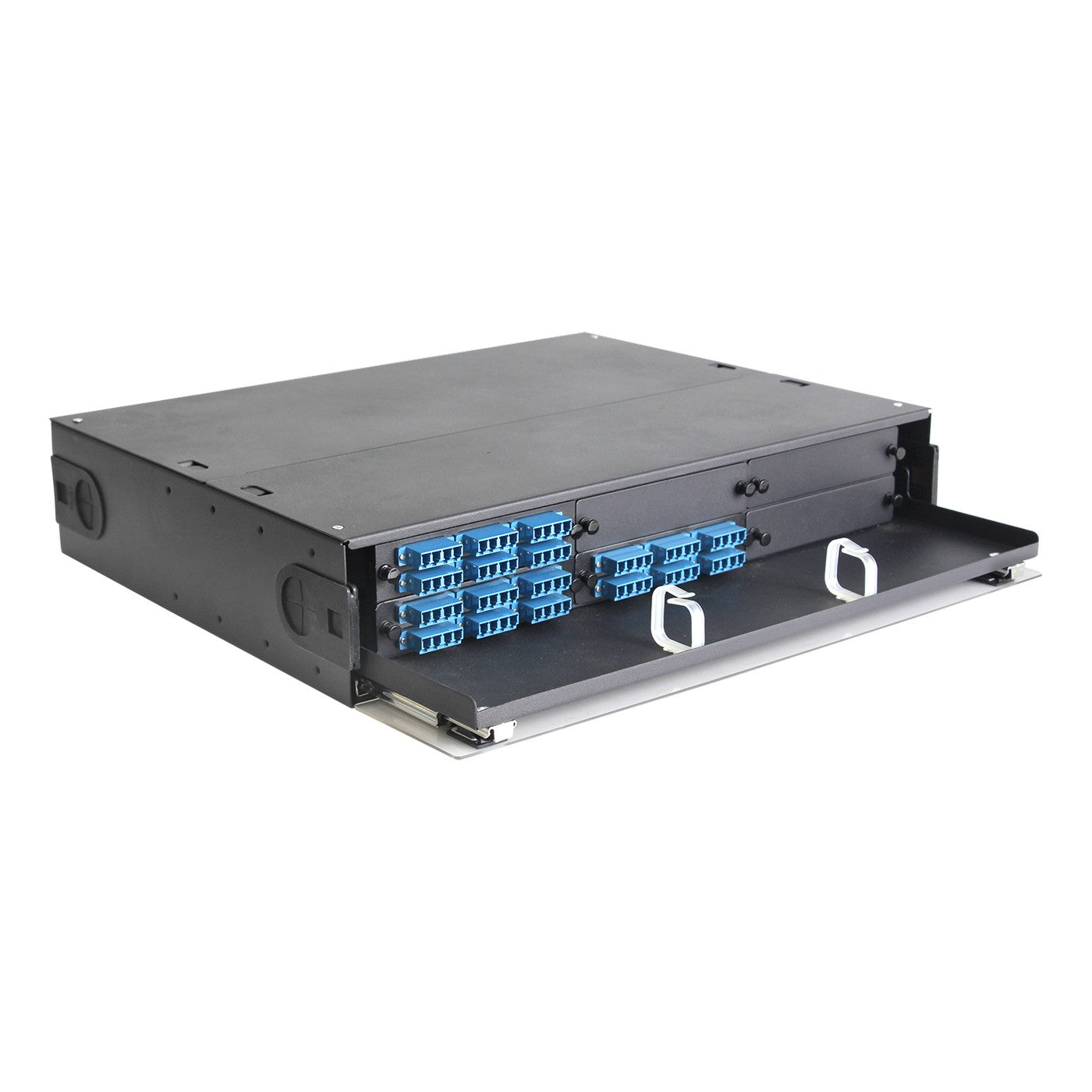 Distribuidor de fibra óptica deslizable de 2UR para 48 fibras monomodo G.652 D, acopladores LC/UPC, terminación y empalme para montaje en rack