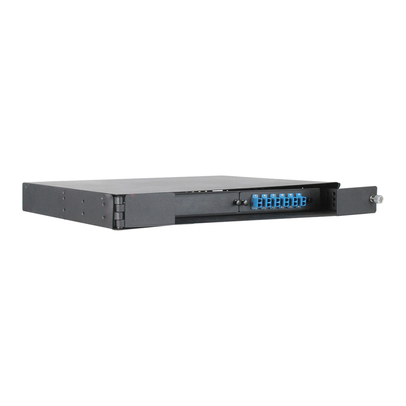 Distribuidor de fibra óptica abatible de 1UR para 6 fibras monomodo G.652 D, acopladores LC/UPC, terminación y empalme para montaje en rack