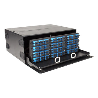 Distribuidor de fibra óptica deslizable de 4UR para 96 fibras monomodo G.652 D, acopladores SC/UPC, terminación y empalme para montaje en rack