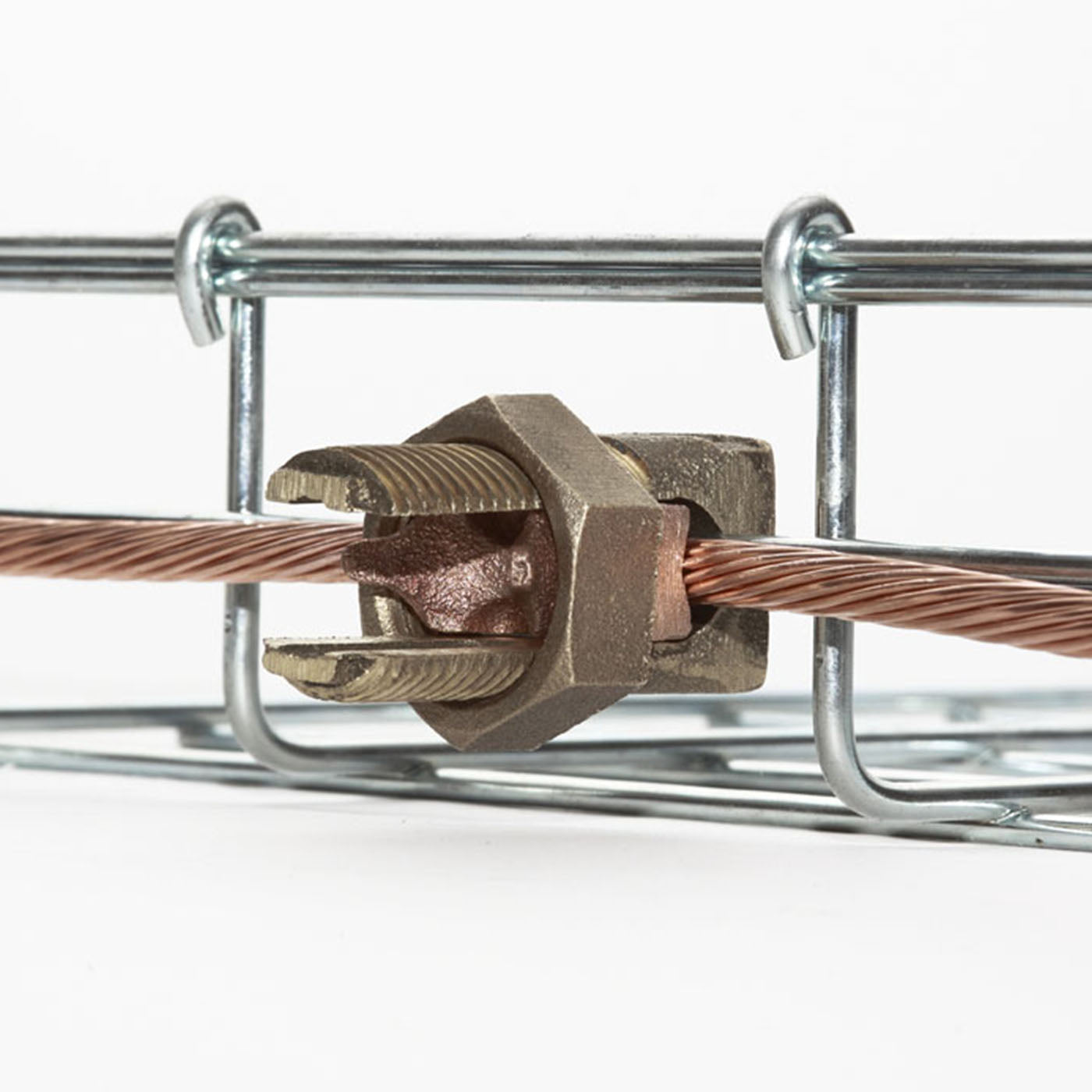 La puesta a tierra CHAROFIL es un conector mecánico bipartido en cobre diseñado para unir conductores de calibre 6 AWG a 2 AWG y garantizar continuidad equipotencial en charolas tipo malla y bandejas portacables.
