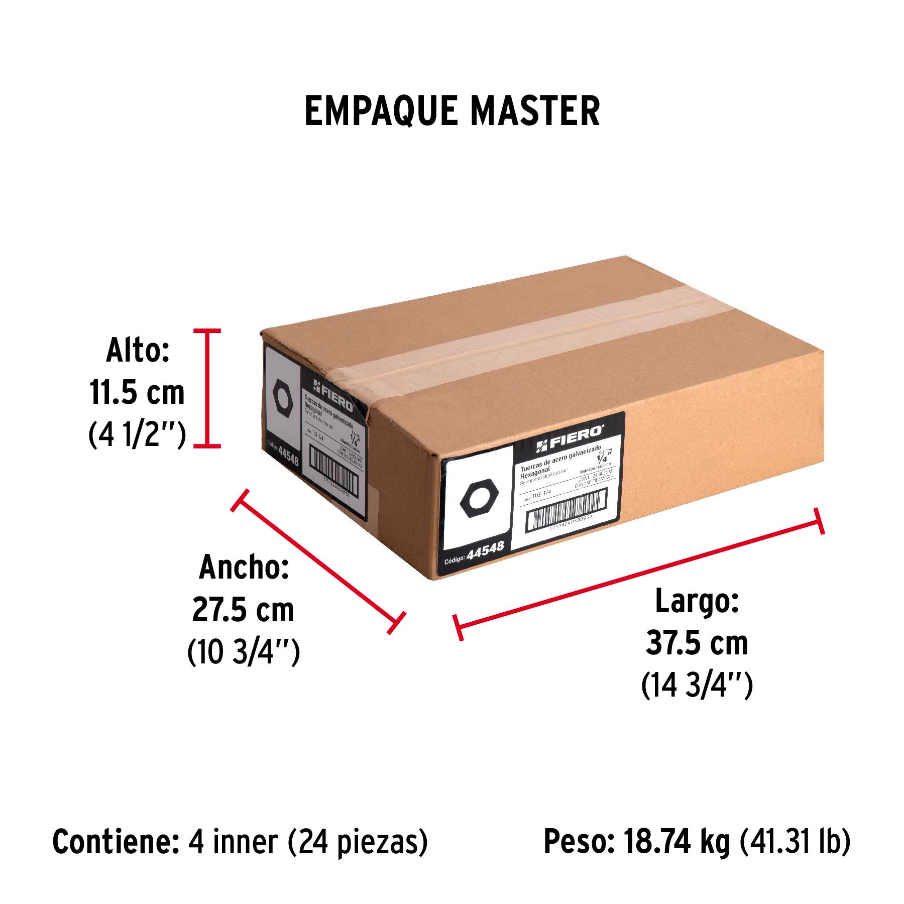 La tuerca hexagonal galvanizada de 1/4″ FIERO es un elemento de fijación de alta precisión, diseñado para ensamblajes industriales y de construcción que requieren robustez y resistencia a la corrosión.