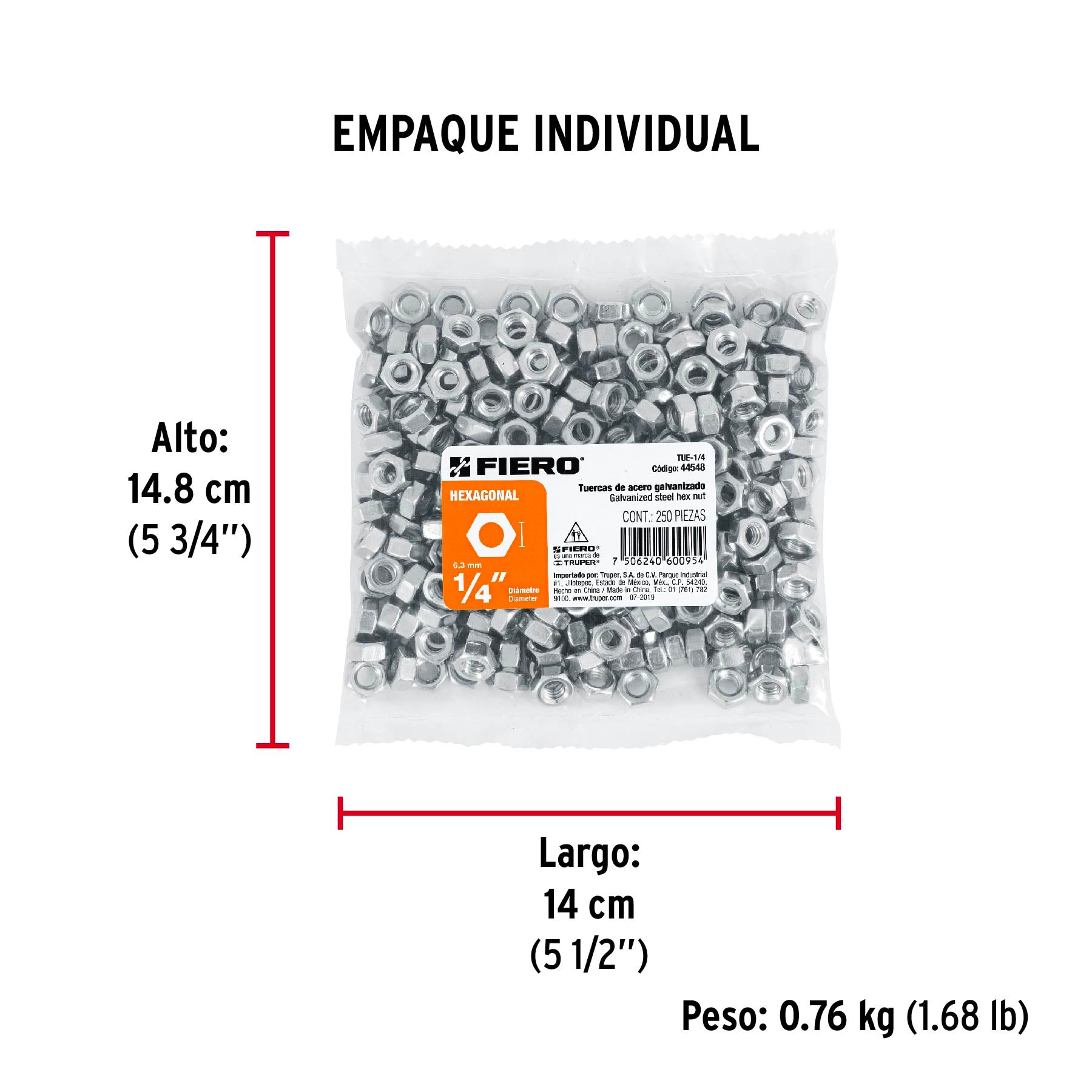 Tuerca hexagonal galvanizada de 1/4", bolsa con 250 piezas