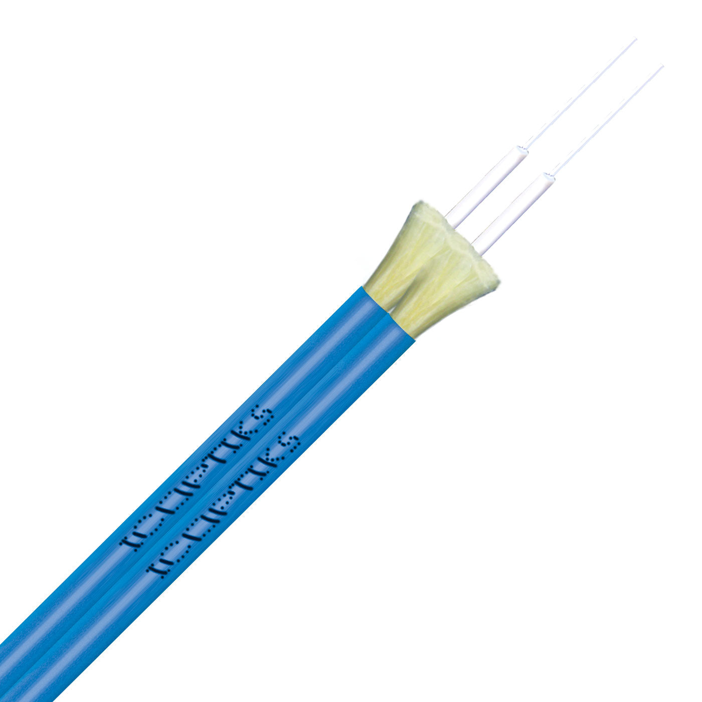 Cable de fibra óptica interior dúplex (2 fibras) monomodo G.657 A2 (9/125), totalmente seco, cable de 1.6 mm, cubierta LSZH color azul marino, refuerzo de aramida, tubo apretado de 900 µm