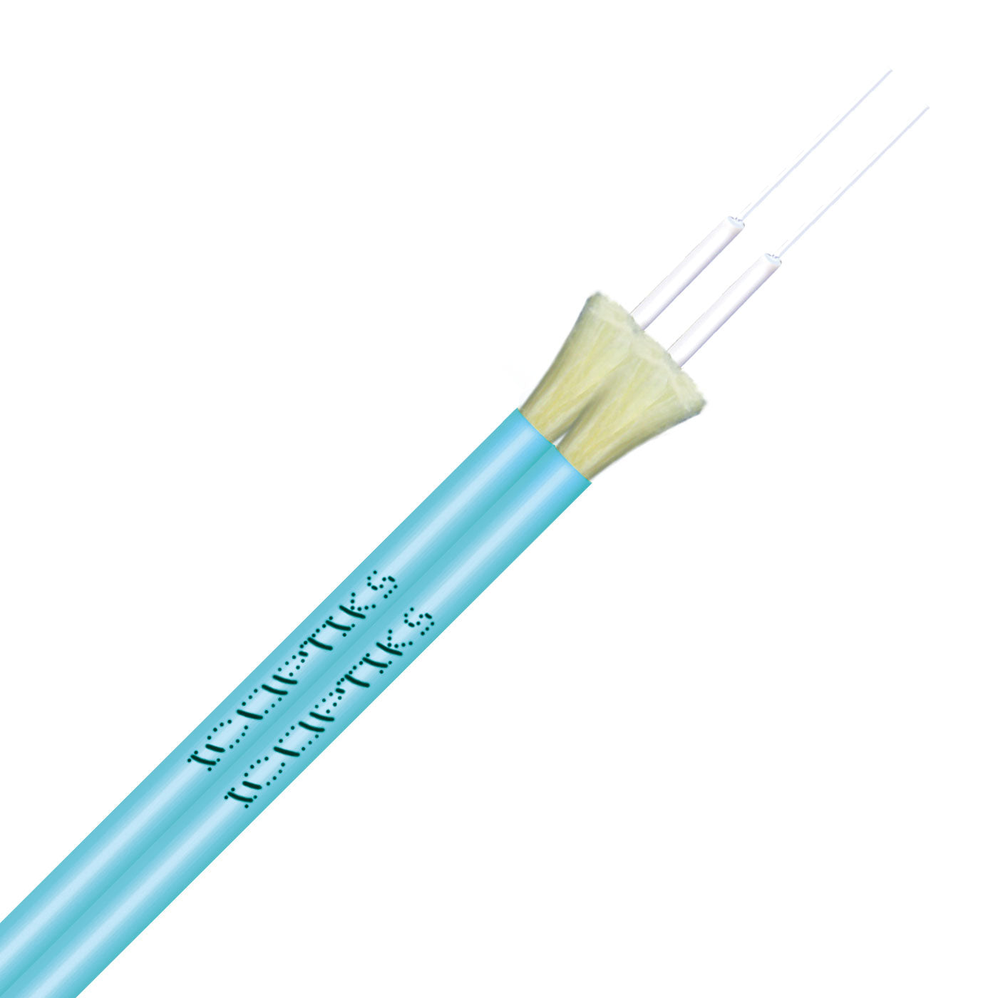Cable de fibra óptica interior dúplex (2 fibras) multimodo OM3 (50/125), totalmente seco, cable de 1.6 mm, cubierta LSZH color aqua, refuerzo de aramida, tubo apretado de 900 µm