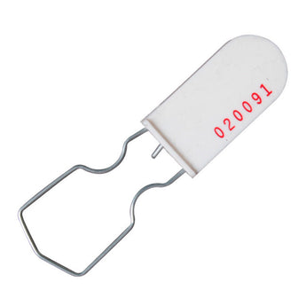 Precinto de seguridad de plástico color blanco tipo candado con numeración consecutiva y alambre galvanizado de 1/16"