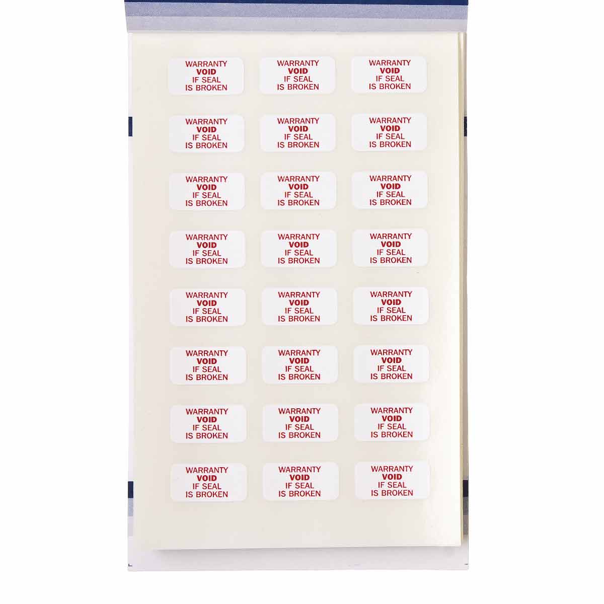 Sello de película de vinil contra manipulaciones de 0.375" x 0.75" leyenda "Warranty void if seal is broken", paquete con 480 sellos