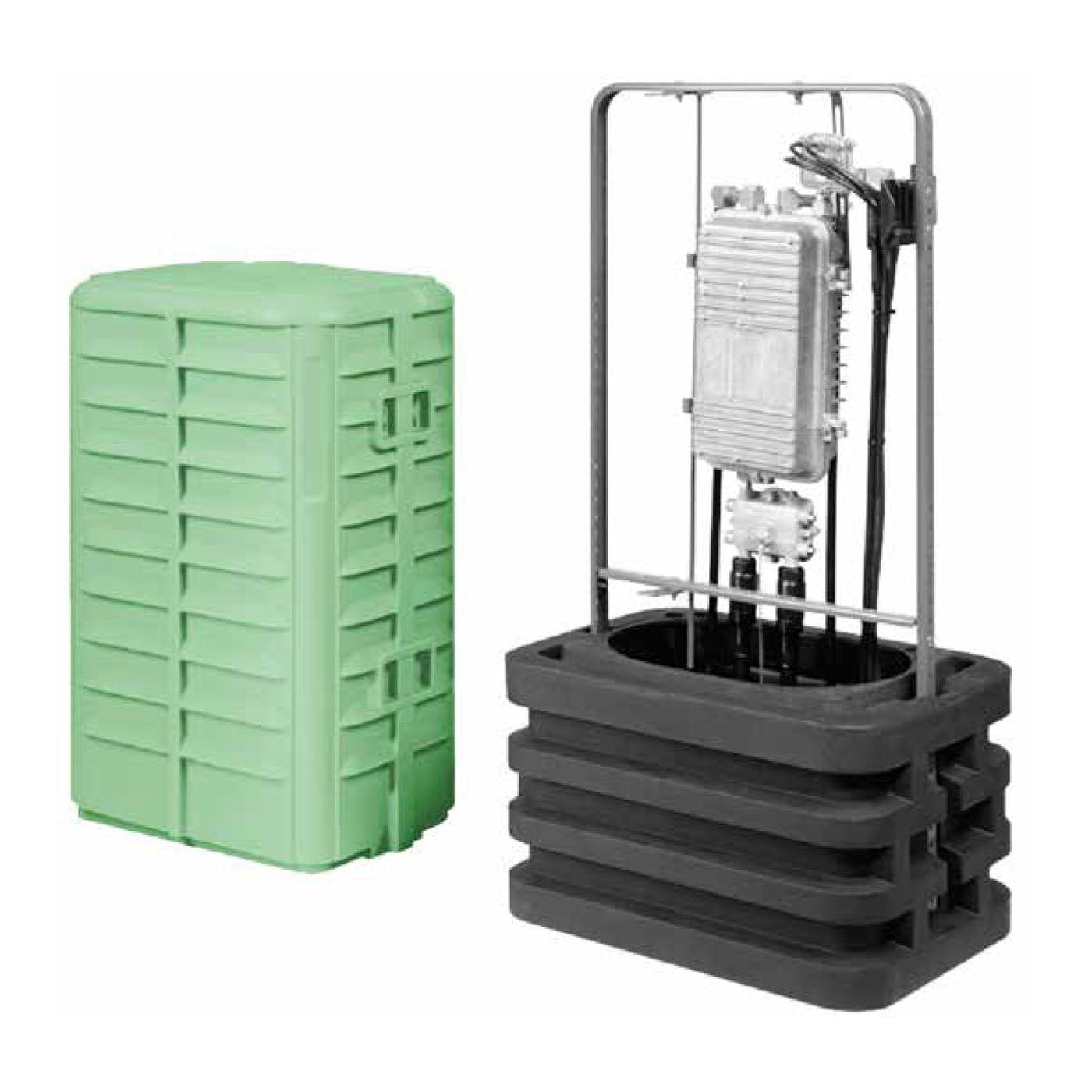 El pedestal SPH 14 × 20 × 34″ en color verde RAL 6005 está diseñado para instalaciones al aire libre que requieren un soporte seguro y estético.
