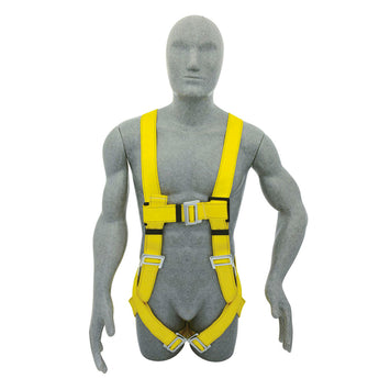 - Arnés contra caídas unitalla con anillo en la espalda y hebillas de conexión rápida, cinta de nylon que resiste la abrasión, químicos y rayos ultravioleta