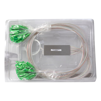 Splitter mini módulo PLC de 1x64 con fibra G.657 A2. Entrada: 900 µm, sin conector. Salida: 900 µm, conectores SC/APC