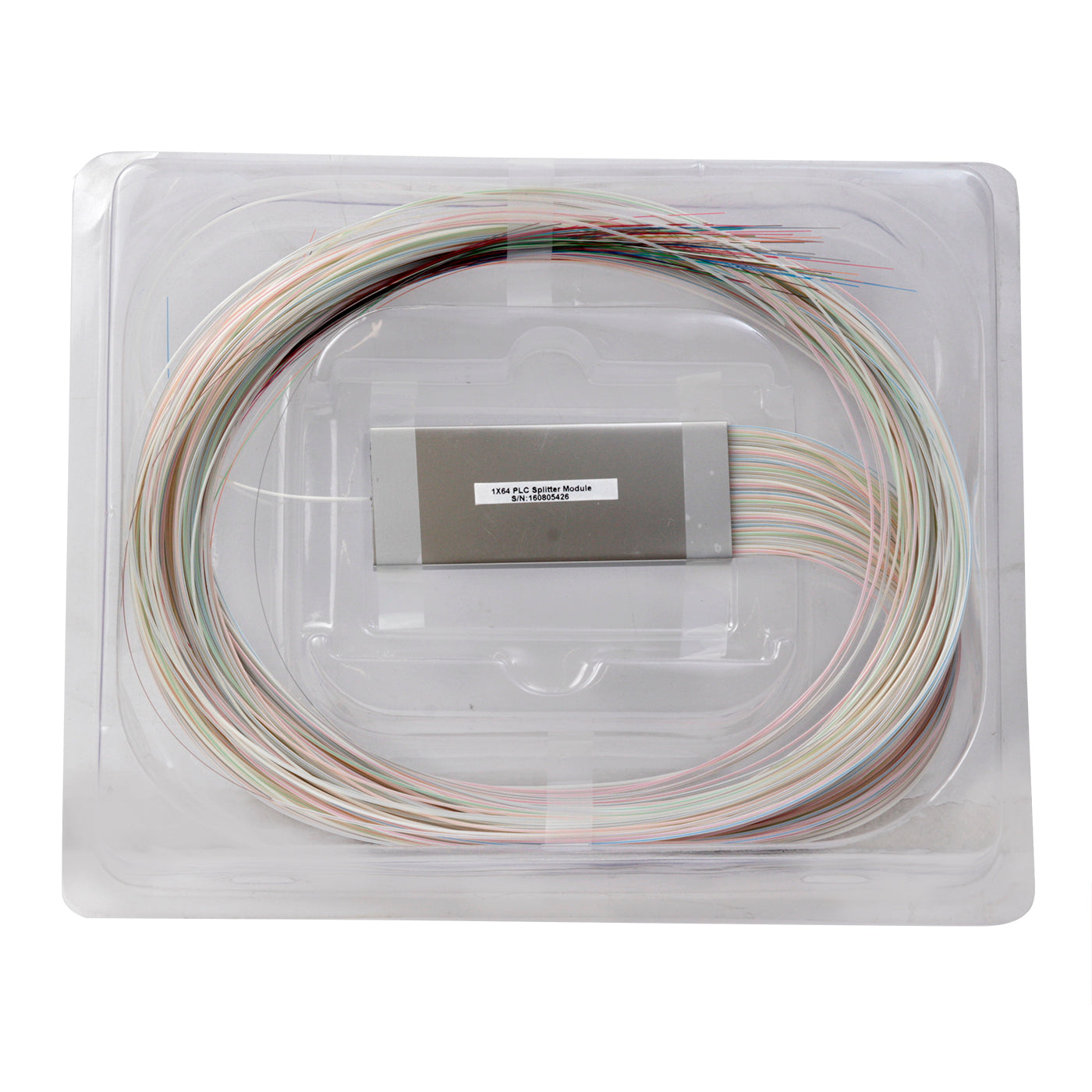 Splitter mini módulo PLC de 1x64 con fibra G.657 A2. Entrada: 900 µm, sin conector. Salida: 900 µm, sin conectores