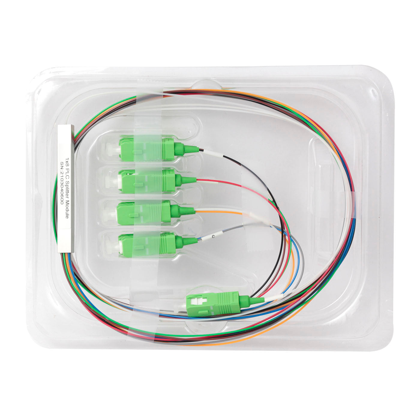 Splitter mini módulo PLC de 1x8 con fibra G.657 A2. Entrada: 900 µm, conector SC/APC. Salida: 900 µm, conectores SC/APC