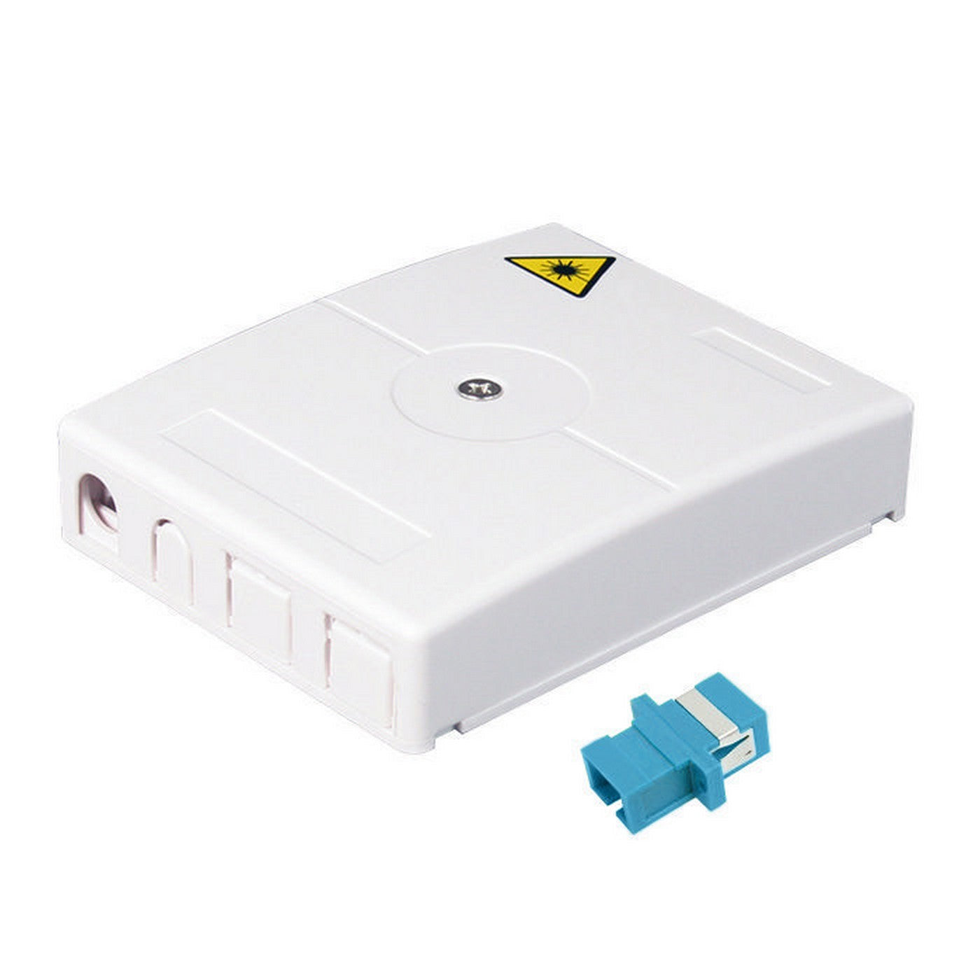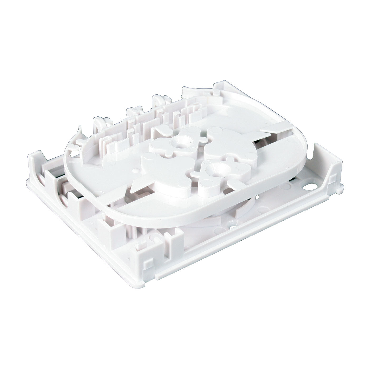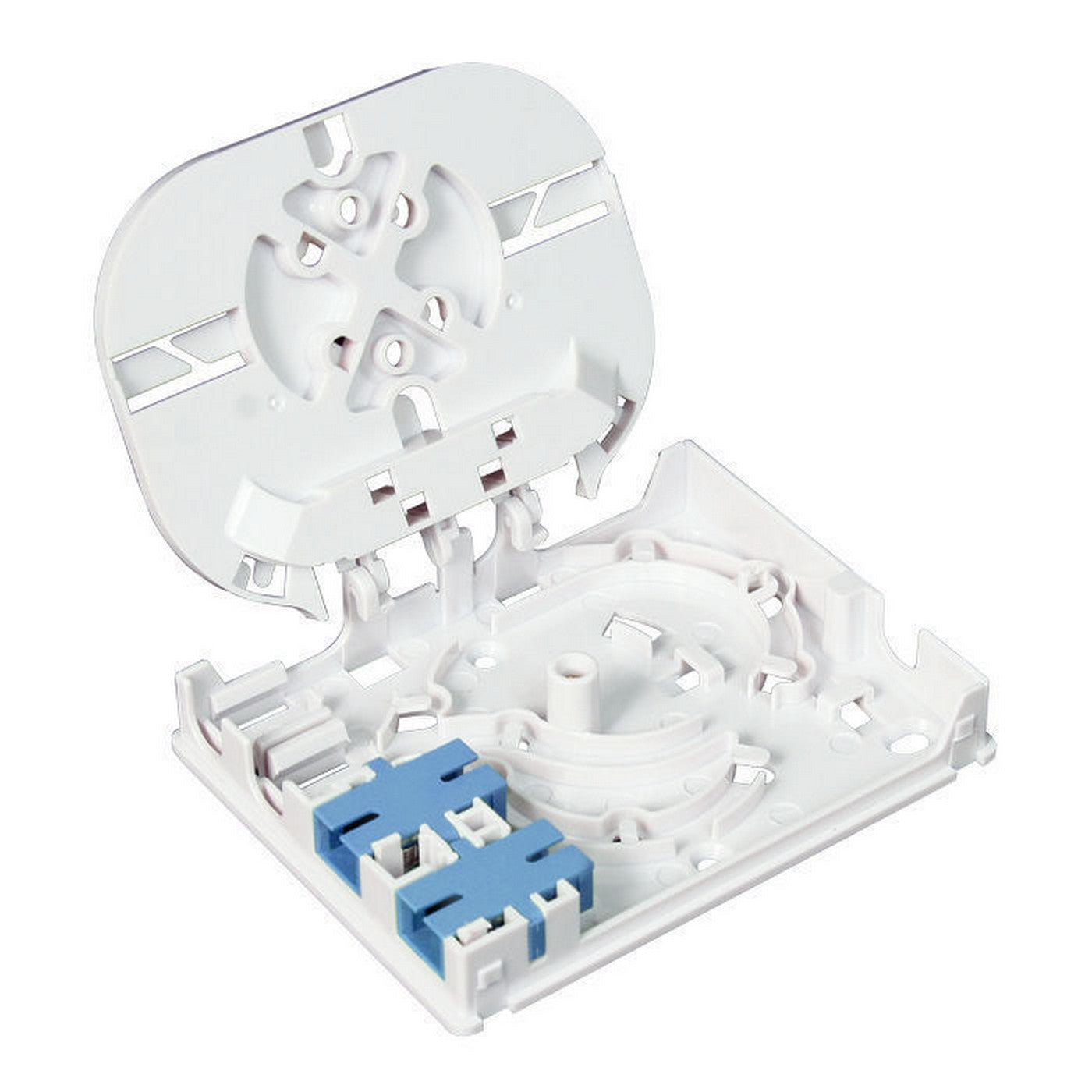Caja terminal interior modelo "A" 5 puertos de entrada de cable, cargada con 2 adaptadores SC/UPC dúplex, pigtail 900 µm y mangas termocontráctiles, capacidad para 4 empalmes por fusión o 2 empalmes mecánicos