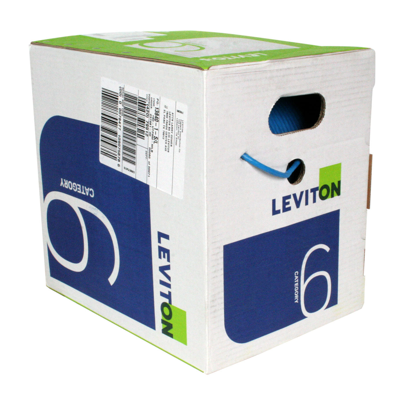 Cable UTP Cat 6+ Leviton, bobina de 305 m, color azul. Rendimiento superior para redes de alta velocidad, ideal para aplicaciones Gigabit Ethernet y PoE.