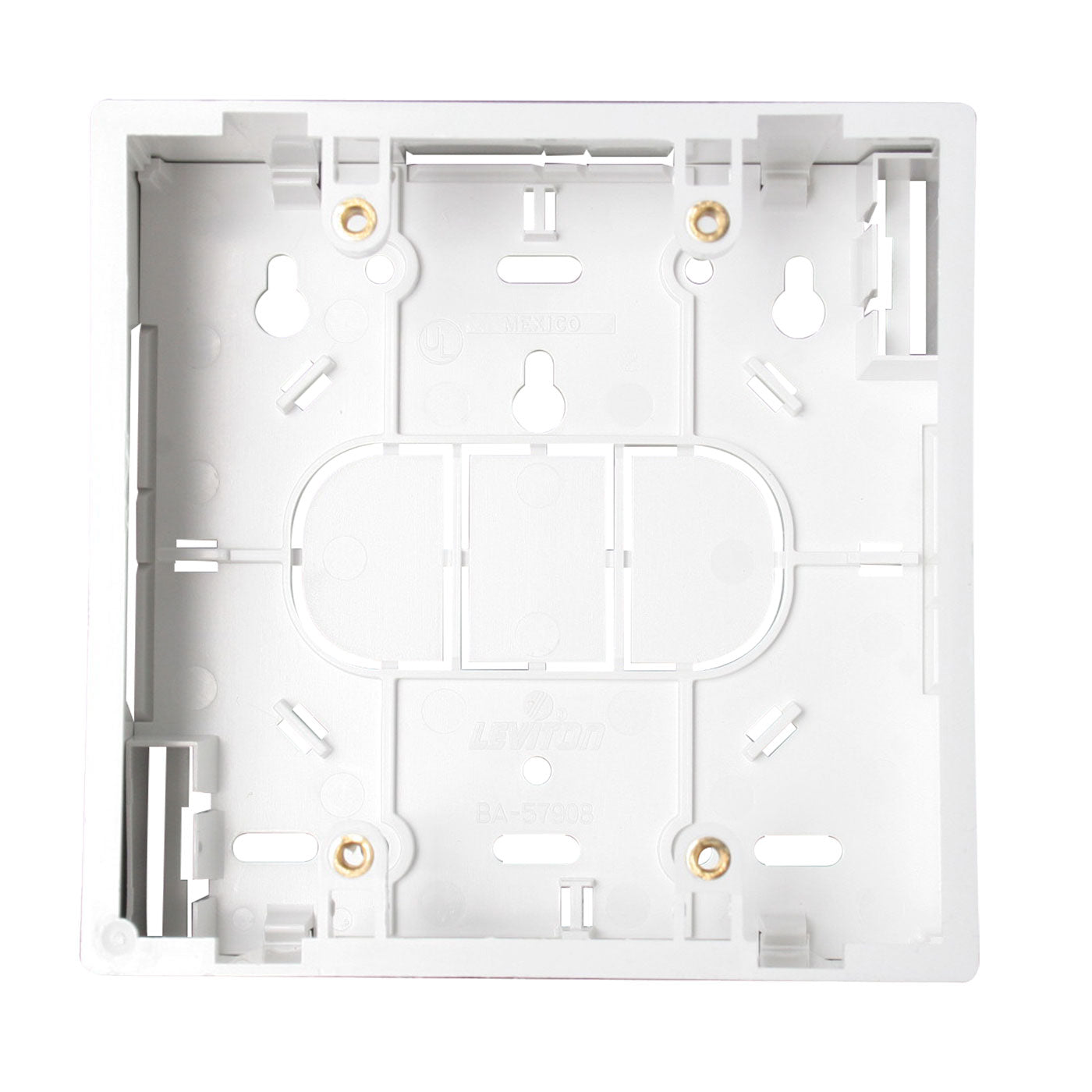 El Leviton 42777-2WA es una caja de montaje en superficie de doble gang, ideal para la instalación de conectividad de bajo voltaje en entornos de pared dura o espacios de oficina abiertos.