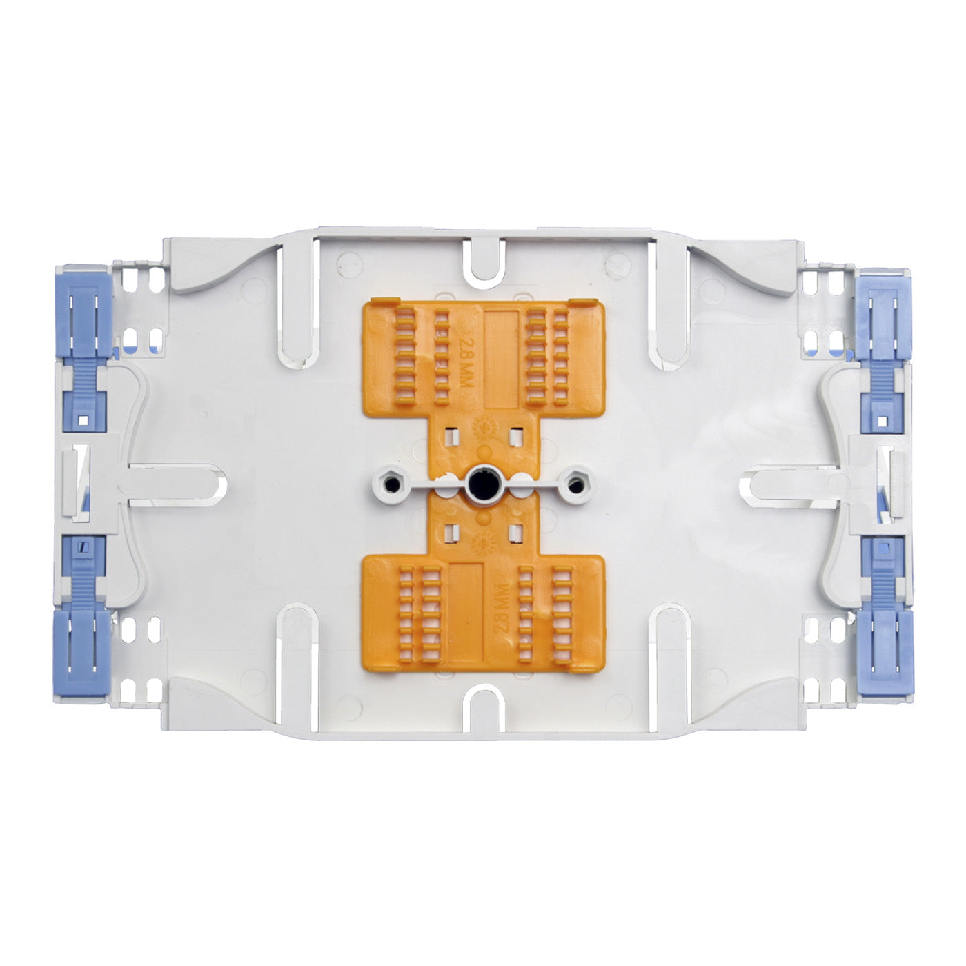 Su construcción en plástico resistente permite alojar hasta 24 fibras, asegurando una organización eficiente dentro de un gabinete de fibra óptica.