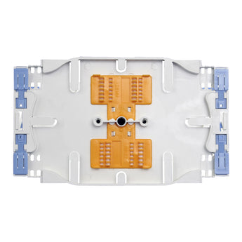 Charola de empalme rectangular con mica y chips de acomodo sencillo para 12 fusiones para distribuidor óptico marca Leviton