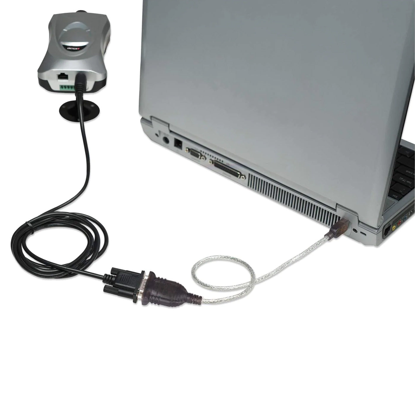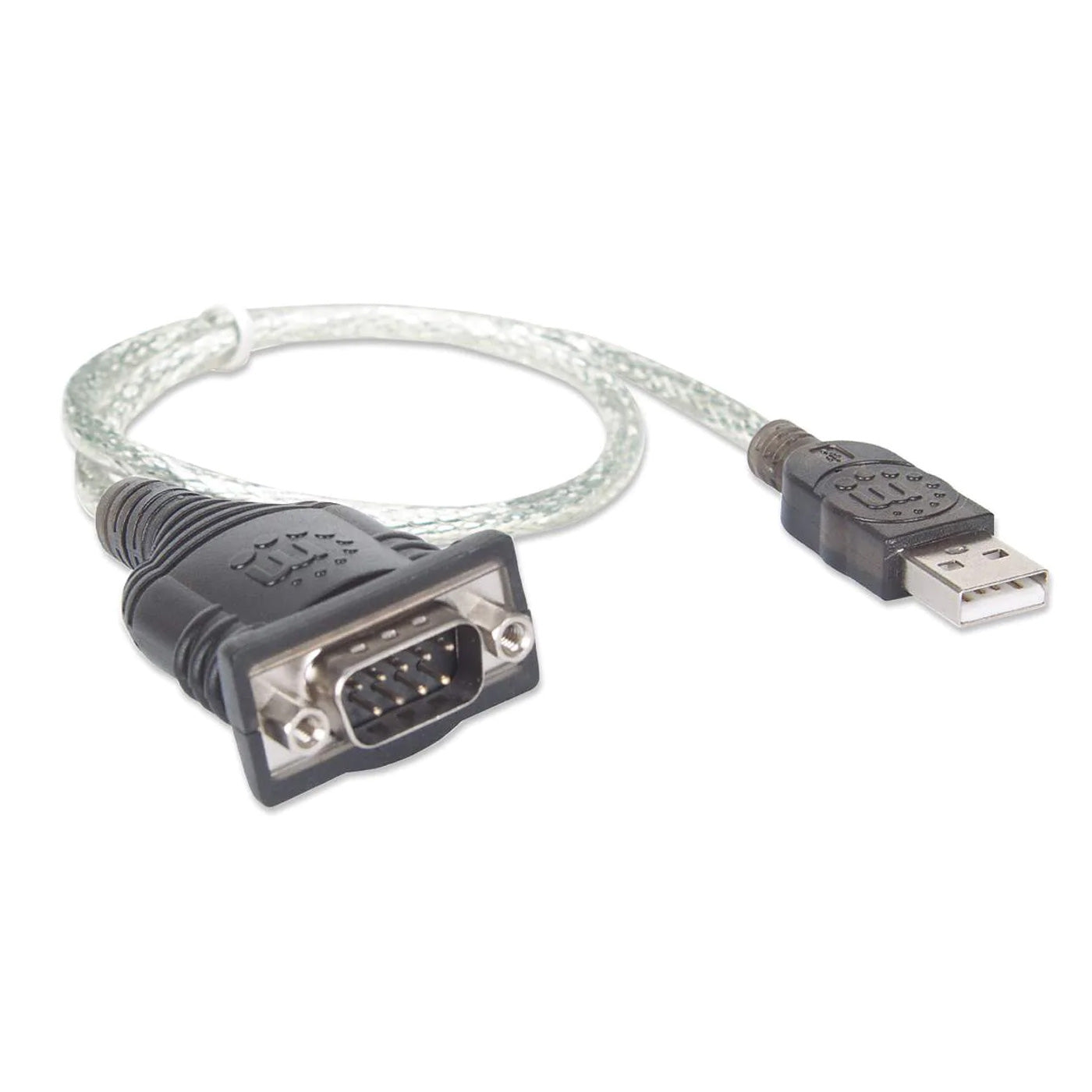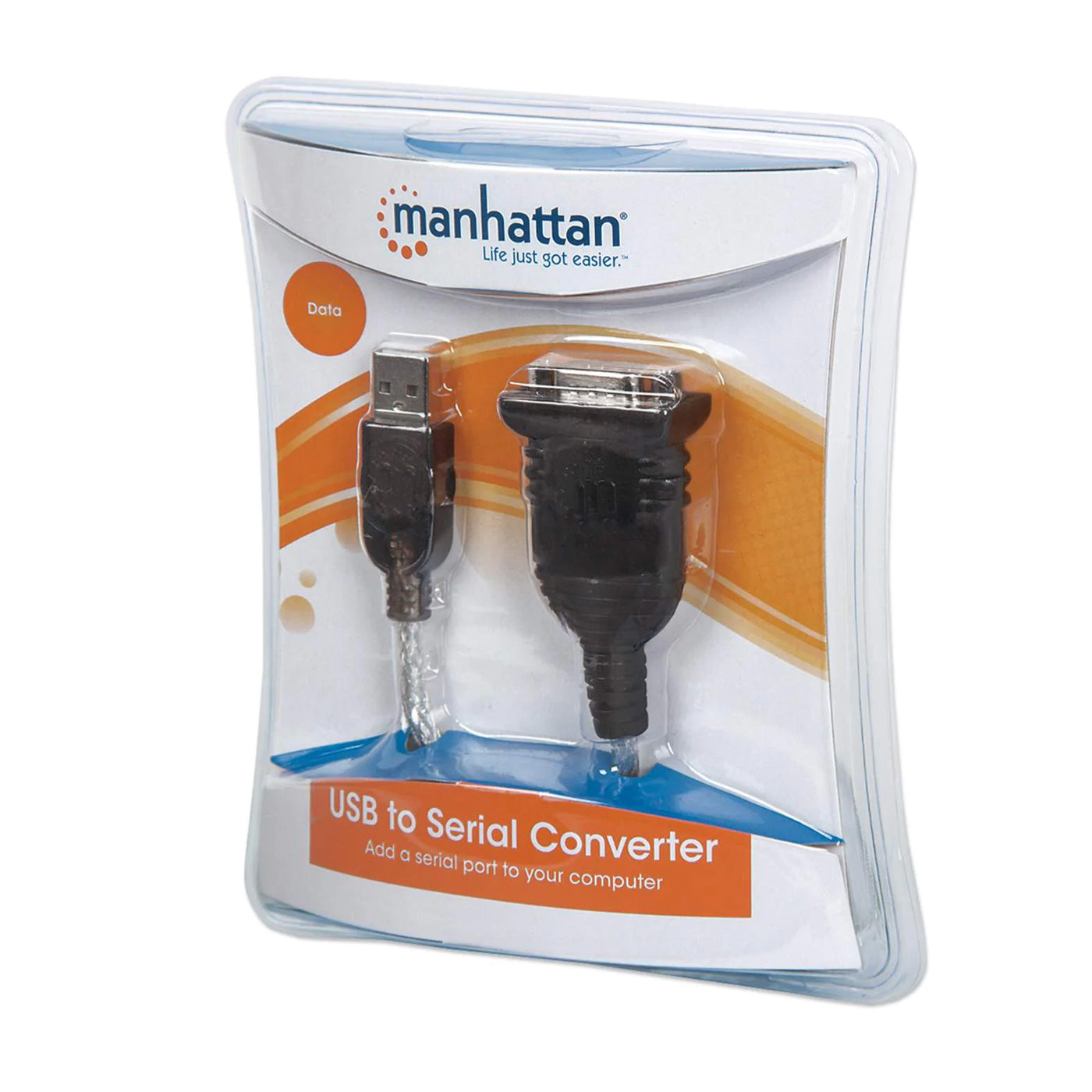 Conecta dispositivos con puerto serial a través de USB con el Convertidor USB a Puerto Serial RS232 Manhattan 205146, una solución práctica para módems, escáneres de códigos de barras, cámaras digitales y más.