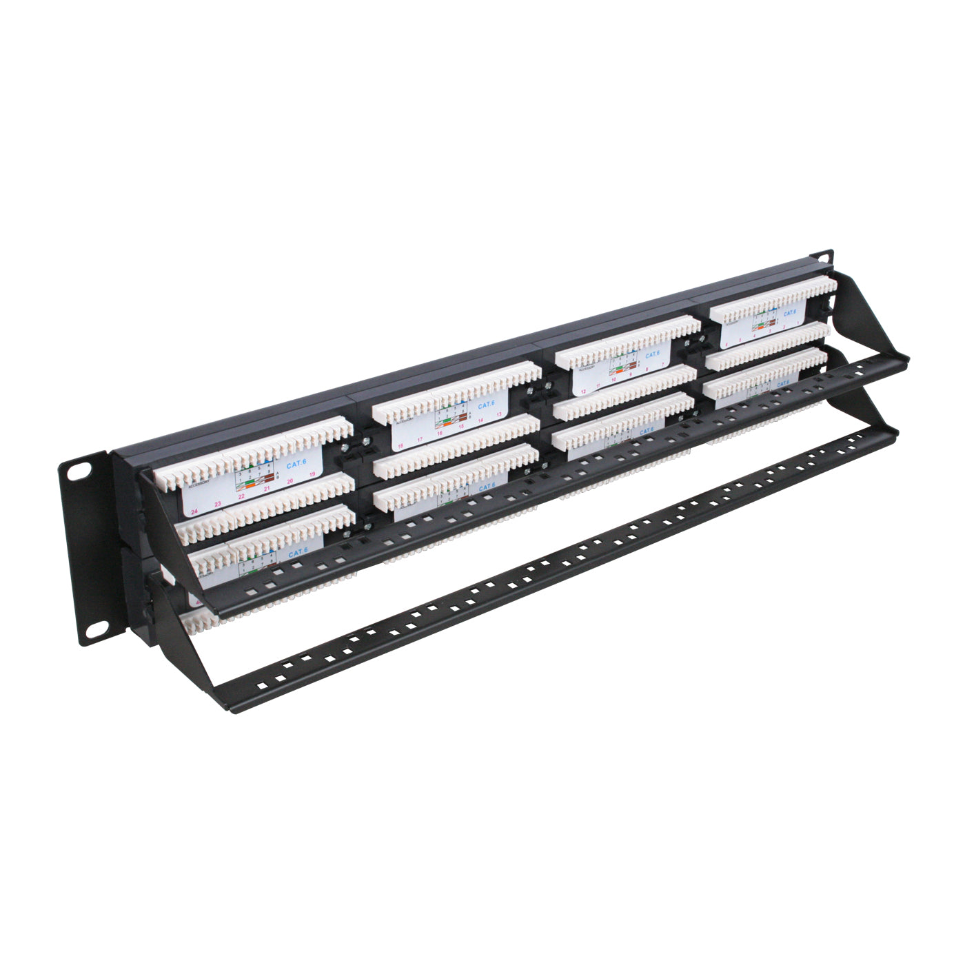 Panel de parcheo recto de 2UR con 48 puertos RJ45 categoría 5e con barra de administración de cable.