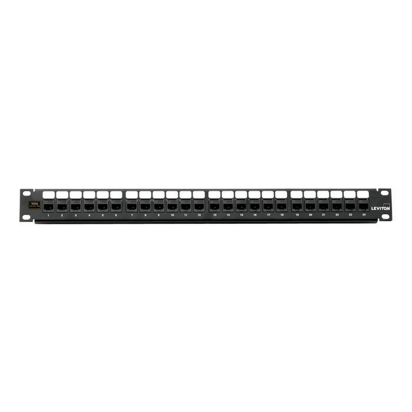 Panel de parcheo Leviton Cat 6 QuickPort, 24 puertos, 1RU, color negro. Diseño modular con tecnología Retention Force para máxima estabilidad y rendimiento.