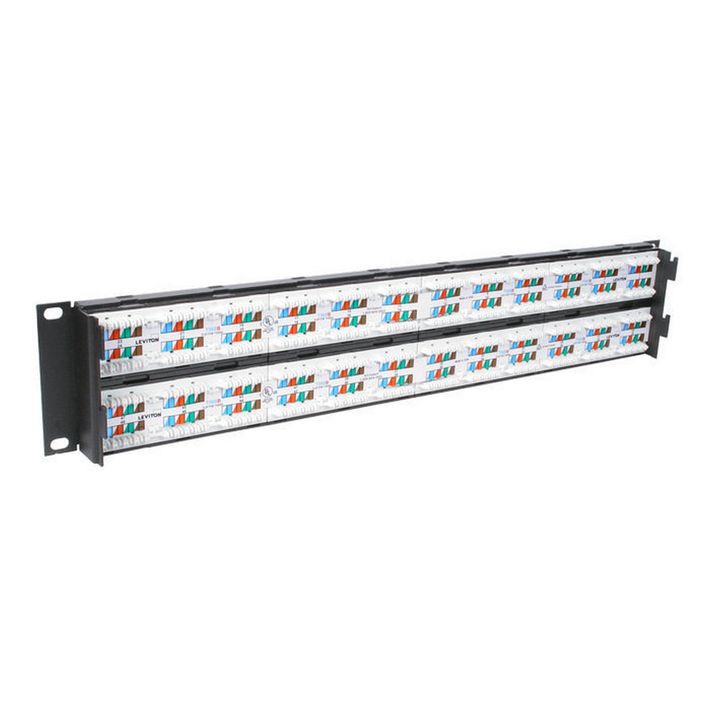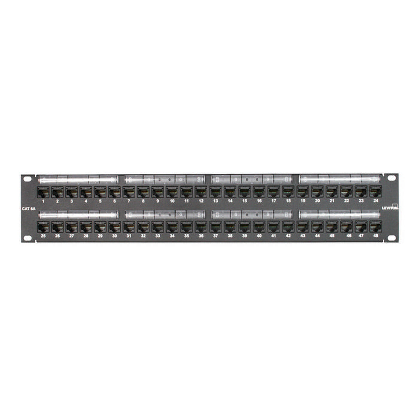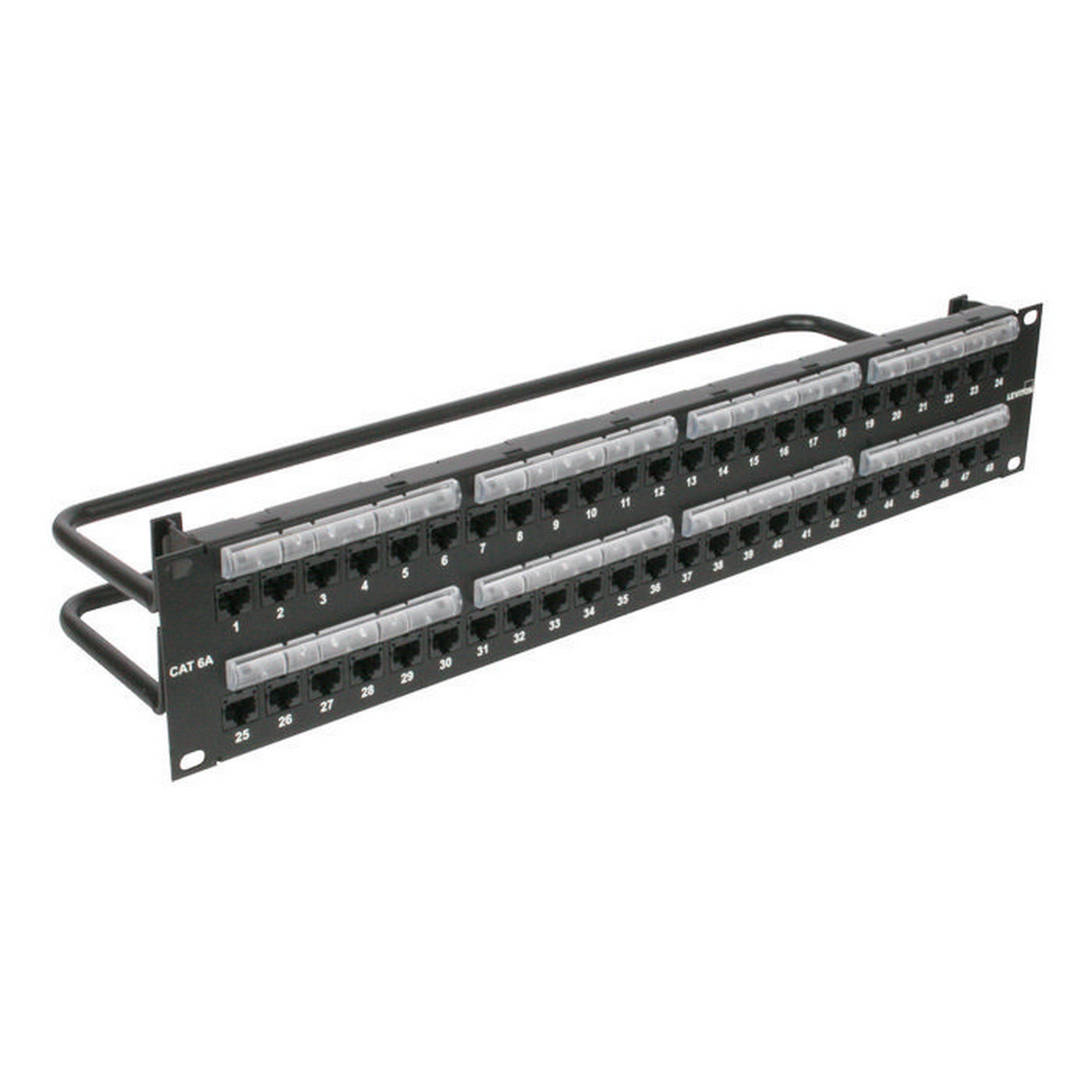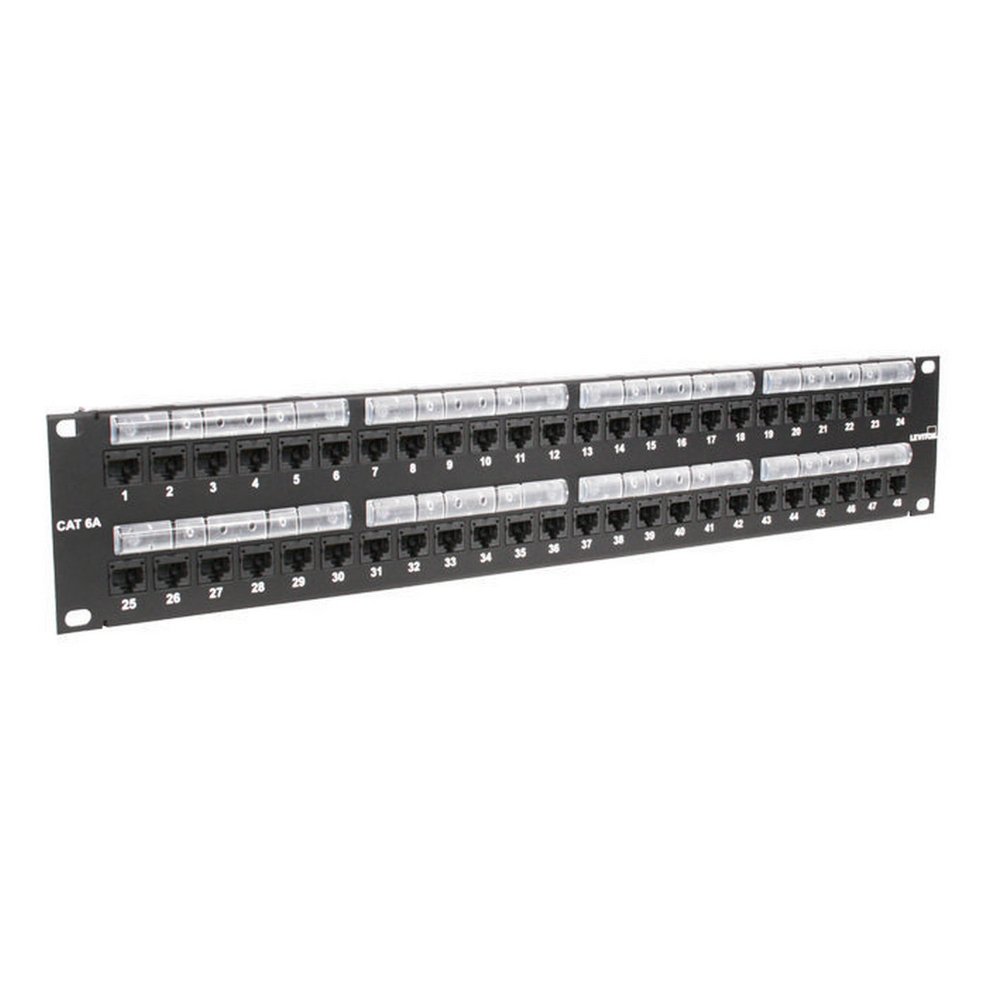 Panel de parcheo recto "eXtreme" 110 de 2UR con 48 puertos RJ45 categoría 6A con barra de administración de cable