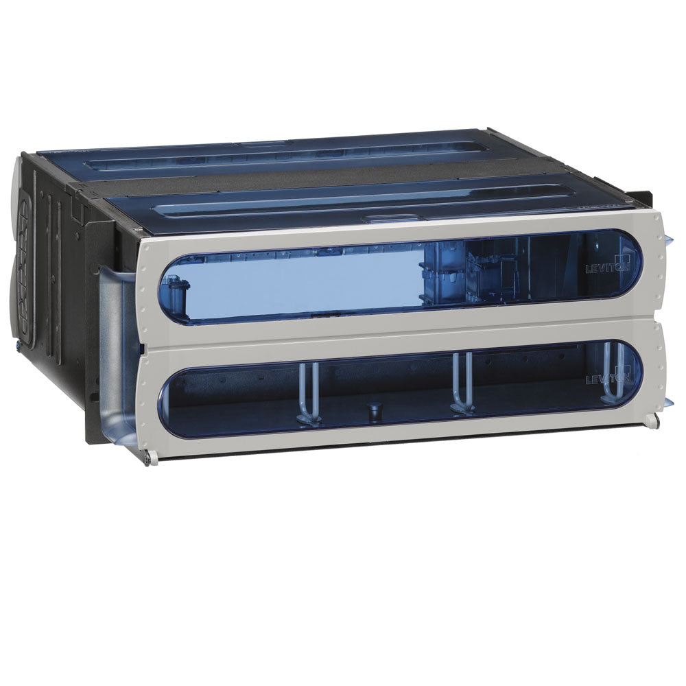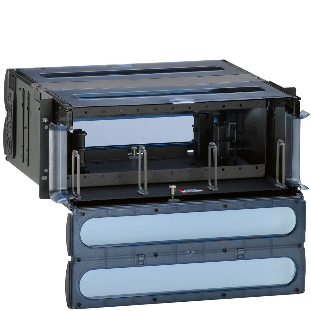 Su diseño vacío con bandeja deslizable permite una instalación flexible y optimizada, admitiendo hasta 12 placas adaptadoras y bandejas de empalmes SDX o 12 cintas MTP SDX.