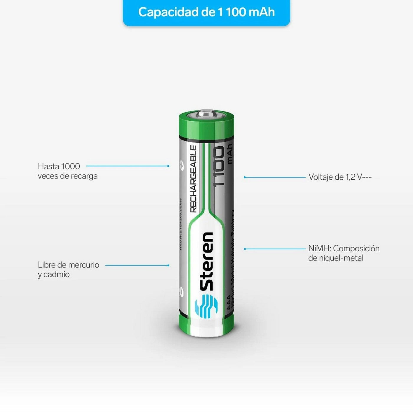 Este paquete de 4 pilas o baterías recargables tipo "AAA" de NiMH (niquel-metal) cuenta con una capacidad de 1100 mAh, para que tus aparatos duren funcionando por mucho más tiempo. Colócalas en juguetes, gadgets, relojes de pared, controles remoto.