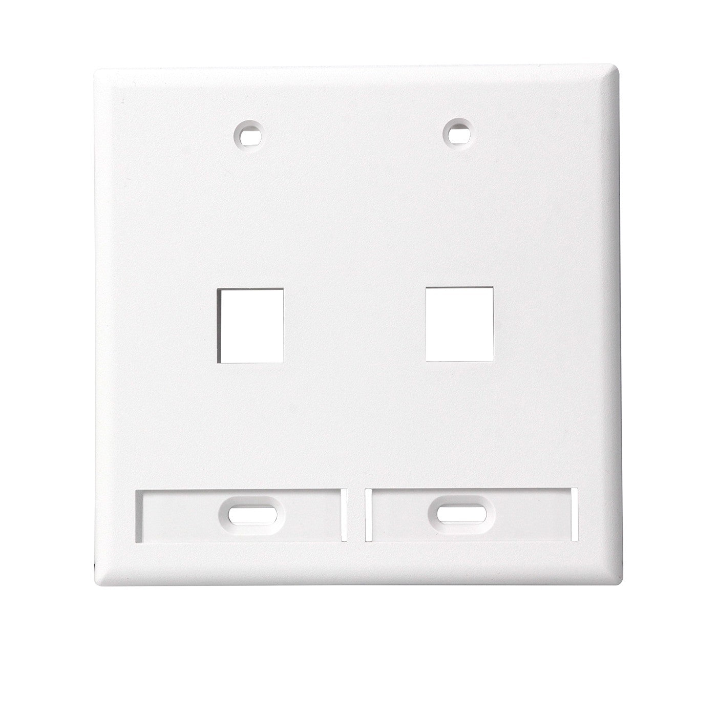 La Leviton 42080-2WP es una placa de pared QuickPort™ de doble gang con 2 puertos, ideal para aplicaciones de voz, datos, audio y video.